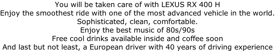 Welcome to VIP-1 transfers VIP-1 transfers is a new company, with 20 years of experience in the in the business I provide the service personally, relying on my experience, commitment and sincerity  My motto is “ Do what what it needs to be done, whatever it takes “ Your Wish is the New Destination VIP-1 transfers has no limits Travel in luxury Best Driver Chauffeur with 40 years of experience Driving in a heavy military environment Being a driving instructor for 20 years in South Africa Engineer in Land Surveying and Mapping Painter